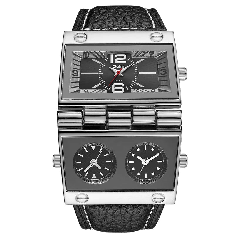 OULM 9525 Big Unique Design Three Time Zone Punk Style Leather Strap Wristwatch For Men