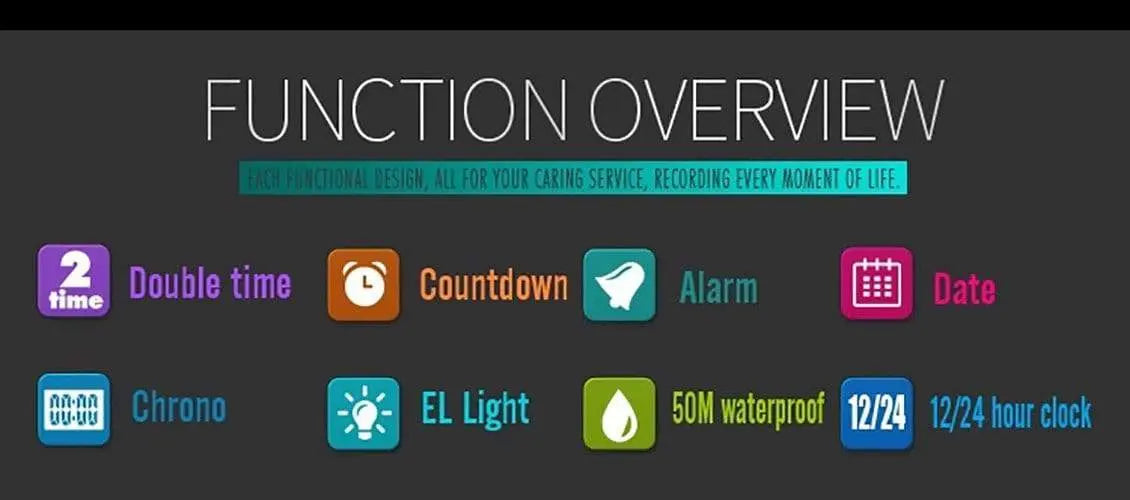 Functions:2 Time,50M Water Resistant,Week Display,Chronograph, Alarm,EL light,12/24 Hour Clock, Stopwatch